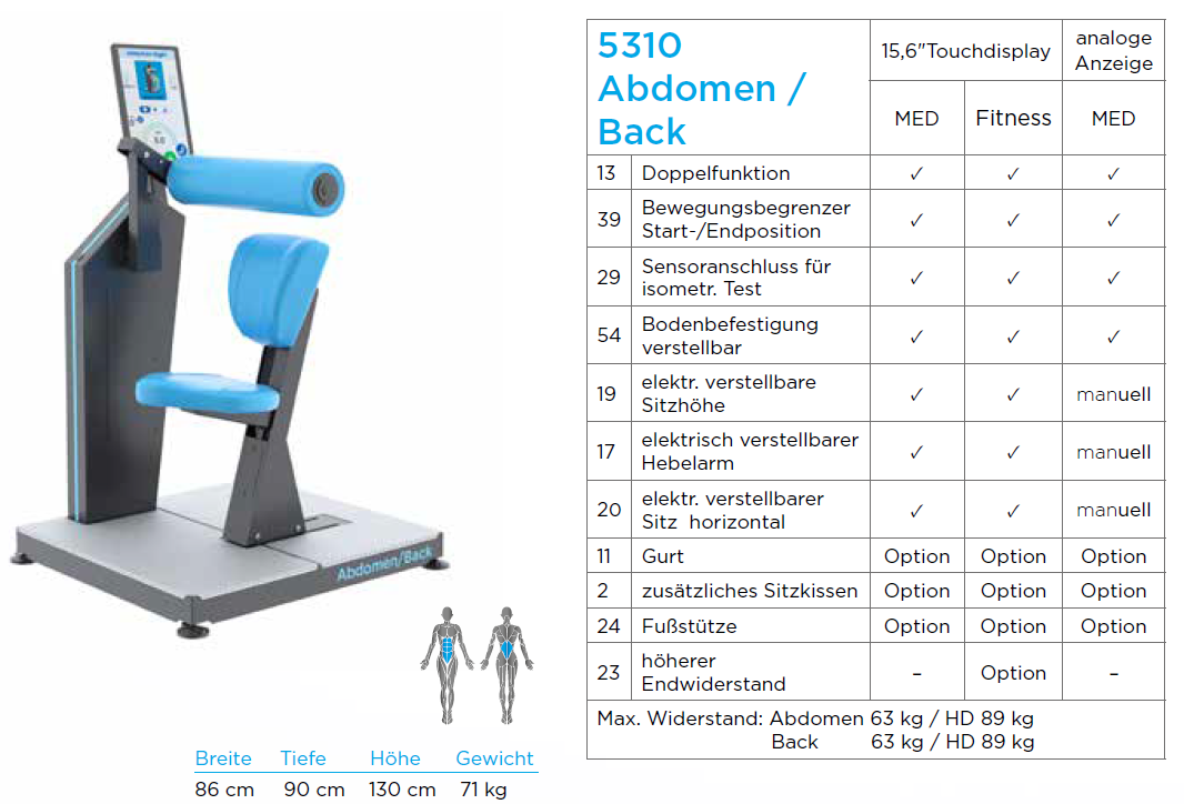 An diesem Trainingsgerät werden sowohl die Bauch- und Rückenmuskeln, als auch die seitlichen Bauchmuskeln trainiert. Es bietet somit vier Trainingsmöglichkeiten. Die Position des Rückenteils, die Länge des Hebelarms und die Sitzhöhe sind stufenweise auf die Größe jedes Benutzers einstellbar.