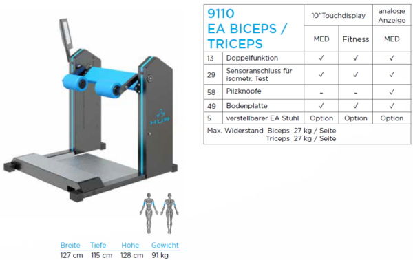 Das Doppelfunktionsgerät verfolgt ein zielgerichtetes Training für die Bizeps-/Trizeps-Muskulatur am selben Gerät. Beide Hebelarme bewegen sich unabhängig voneinander. Zum Testen der isometrischen Kraft läßt sich eine Testeinheit anschließen (HUR Performance Recorder). Das Geräte kann mit Rollstuhl benutzt werden. Rollstuhlfahrer können im eigenen Rollstuhl selbstständig trainieren. Ein mobiler Sitz ermöglicht das Training auch für „Fußgänger“.