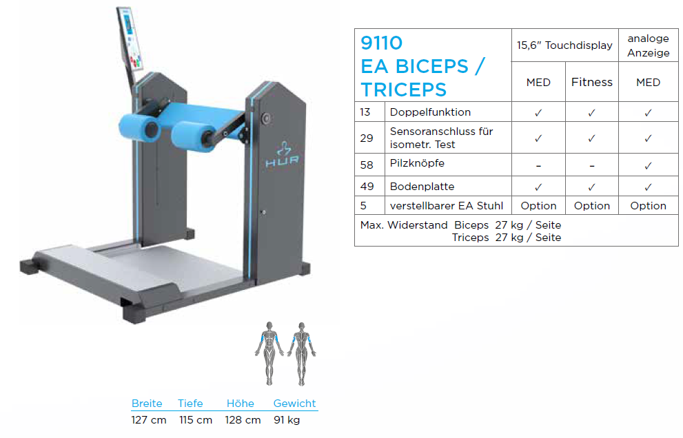Das Doppelfunktionsgerät verfolgt ein zielgerichtetes Training für die Bizeps-/Trizeps-Muskulatur am selben Gerät. Beide Hebelarme bewegen sich unabhängig voneinander. Zum Testen der isometrischen Kraft läßt sich eine Testeinheit  anschließen (HUR Performance Recorder). Das Geräte kann mit Rollstuhl benutzt werden. Rollstuhlfahrer können im eigenen Rollstuhl selbstständig trainieren. Ein mobiler Sitz ermöglicht das Training auch für „Fußgänger“.