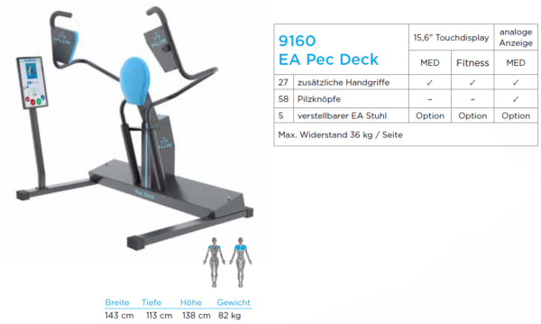 Zum Training der Brust- und Oberkörpermuskulatur ist das Pec Deck-Gerät bestens geeignet. Die praktisch angebrachten Handgriffe unterstützen das Training. Der „Butterfly“ kann mit Rollstuhl benutzt werden. Rollstuhlfahrer können im eigenen Rollstuhl selbstständig trainieren. Ein mobiler Sitz ermöglicht das Training auch für „Fußgänger“.