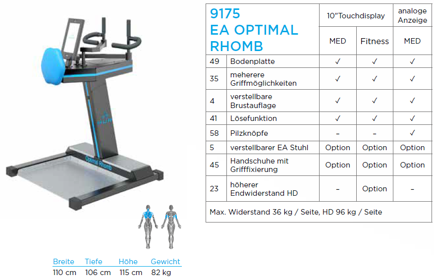 Der Optimal Rhomb wurde für Zielbereich des Rhomboideus-Muskelbereichs entwickelt. Durch Multifunktionsgriffe können die Übungen in verschiedenen Griffpositionen durchgeführt werden. Rollstuhlfahrer können mit dem eigenen Rollstuhl im „Rudergerät“ selbstständig trainieren. Ein mobiler Sitz ermöglicht das Training auch für „Fußgänger“.